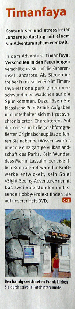 ...Dabei stellt sich Timanfaya nicht nur als Sight-Seeing-Adventure, sondern als liebevoll designtes Eigengewächs mit Lerneffekt heraus. Nicht nur, dass die Kriminalgeschichte, die rundum das Abenteuer gesponnen wurde, fast schon professionell vertont wurde, auch die Rätsel verlangen dem Spieler einiges ab.