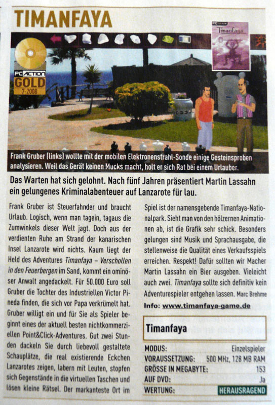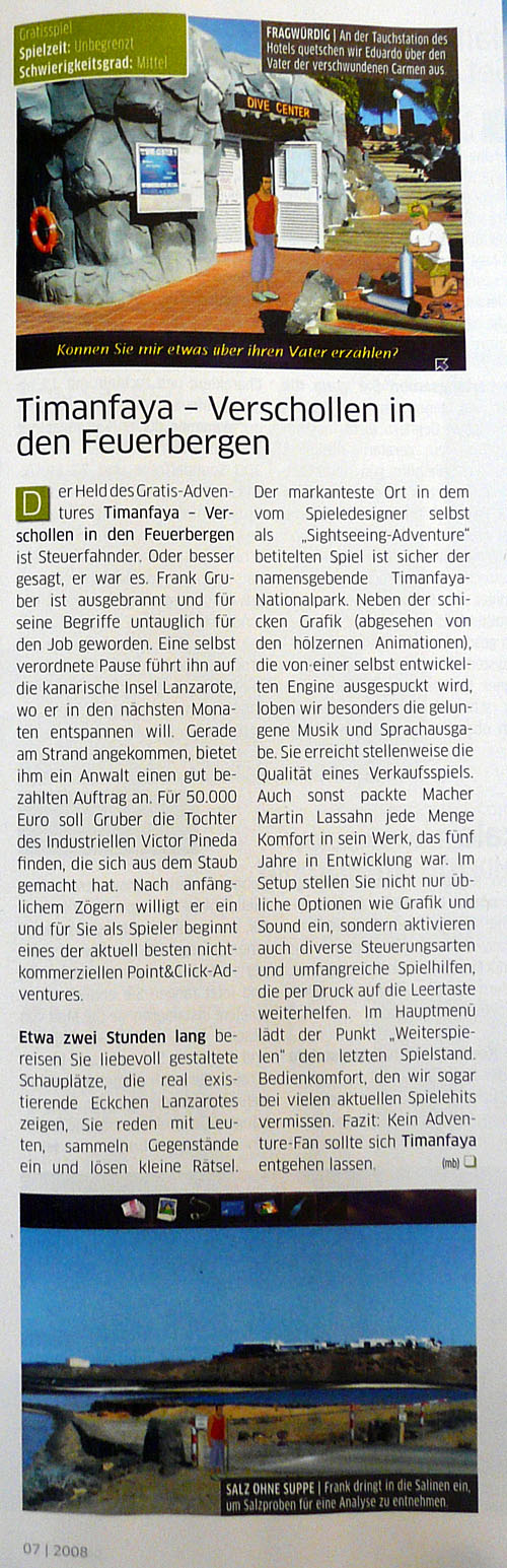 "Besonders gelungen sind Musik und Sprachausgabe, die stellenweise die Qualität eines Verkaufsspiels erreichen. Respekt! Dafür sollten wir Macher Martin Lassahn ein Bier ausgeben. Vielleicht auch zwei. Timanfaya sollte sich definitiv kein Adventurespieler entgehen lassen."